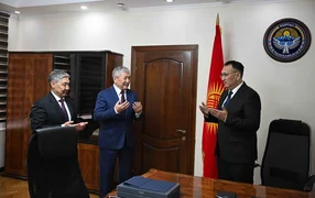 Бишкек, 19.03.26. /Кабар/. Председатель кабинета министров-руководитель администрации президента КР Адылбек Касымалиев представил коллективу центрального аппарата Министерства финансов нового главу ведомства - Руслана Суйналиева.
