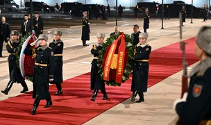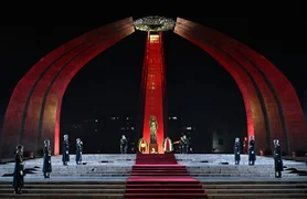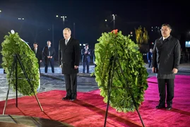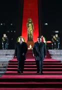 Как сообщили в Админстрации президента КР, под звуки фанфар военного оркестра гвардейцы установили венки у мемориала, после чего главы государств, склонив головы, почтили память павших героев.