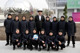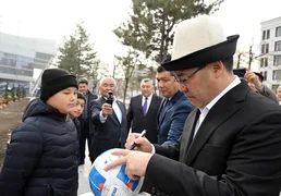 Глава государства подписал футбольный мяч и символически передал его будущему поколению.